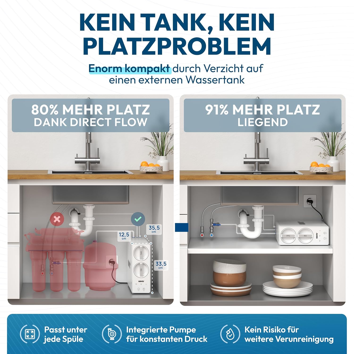 Zum anderen spart das tanklose Design wertvollen Stauraum unter der Spüle. Die kompakte Bauweise der Anlage ermöglicht eine platzsparende Montage, sodass selbst in kleineren Küchen oder Wohnungen ausreichend Platz für Vorräte, Putzutensilien oder andere Gegenstände bleibt. Die Anlage kann sogar liegend installiert werden – beispielsweise hinter einem Sockel oder in engen Schränken – was sie zur idealen Lösung für modernes, minimalistisches Wohnen macht. Gleichzeitig beeinträchtigt die kompakte Form keineswegs die Leistung: Die aora Giulia-L GT600 liefert bis zu 2.000 Liter gereinigtes Osmosewasser pro Tag bei einem hervorragenden Abwasserverhältnis von nur 3:1. Das bedeutet: Für drei Liter gereinigtes Wasser entsteht nur ein Liter Abwasser – eine hervorragende Bilanz, die sowohl ökologisch als auch ökonomisch überzeugt.