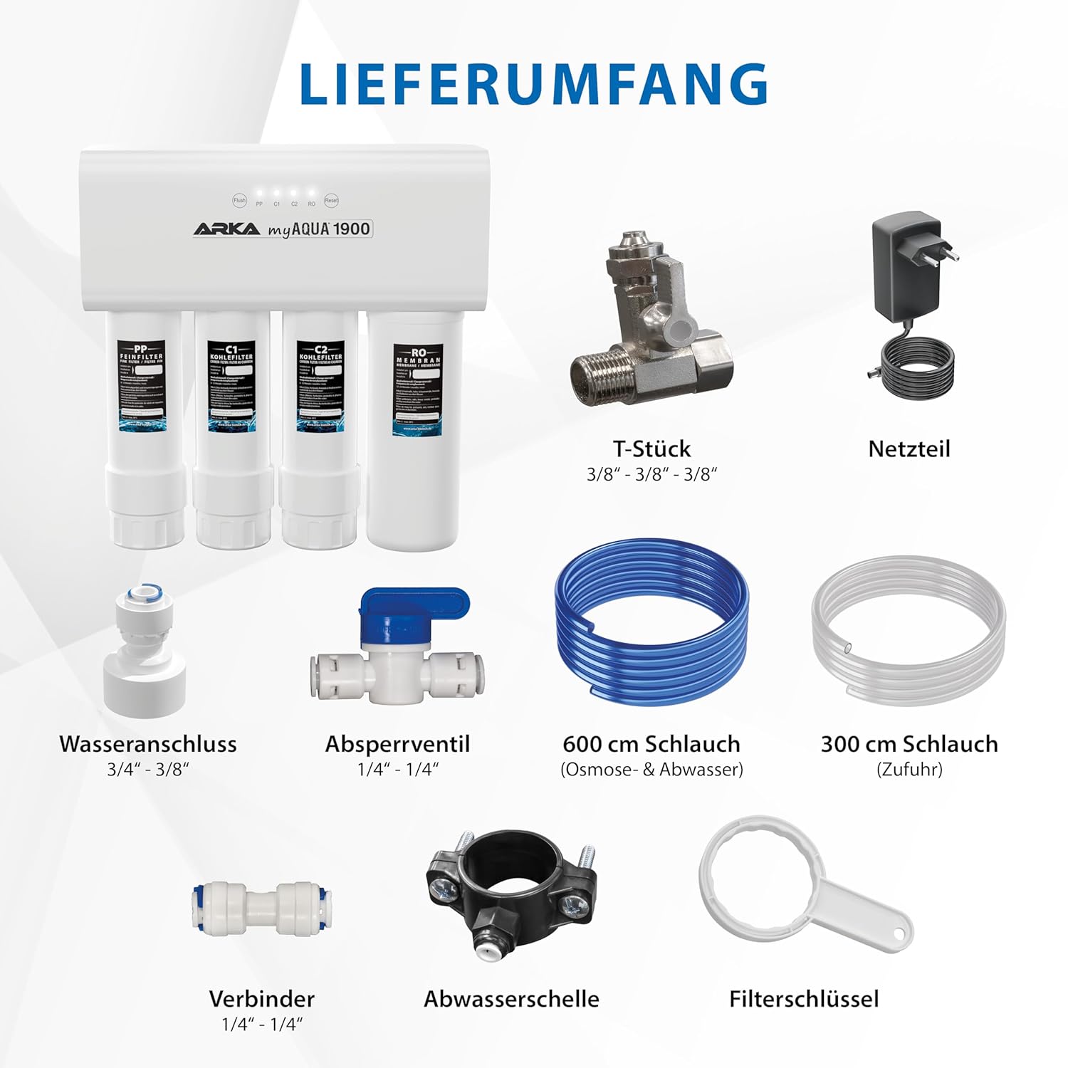 Das ARKA myAqua 1900 ist ein wahres Multitalent, das nahezu jeden Bereich Ihres Zuhauses mit hochreinem Wasser versorgt. Ob als zuverlässiger Wasserlieferant für Ihr Riffaquarium, als Basis für gesundes Kochwasser in der Küche oder als Quelle für den kristallklaren Gartenteich – diese Anlage meistert jede Herausforderung mit Bravour.