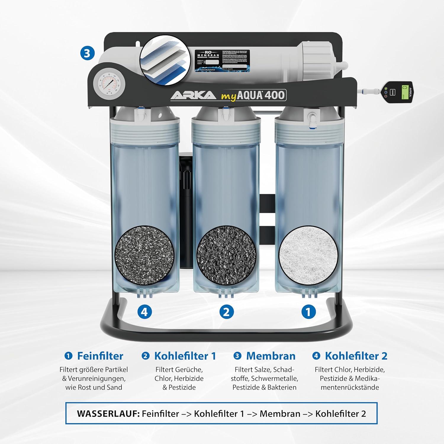 ARKA myAQUA 400 Reverse Osmoseanlage – Bis zu 400 Liter pro Tag – Integrierte Druckerhöhungspumpe – Hochleistungs-Wasserfilter & Enthärtungs-System – Entfernt bis zu 99 % Salze, Schadstoffe & Bakterien – Für Aquarien, Teiche, Haushalt & Labor