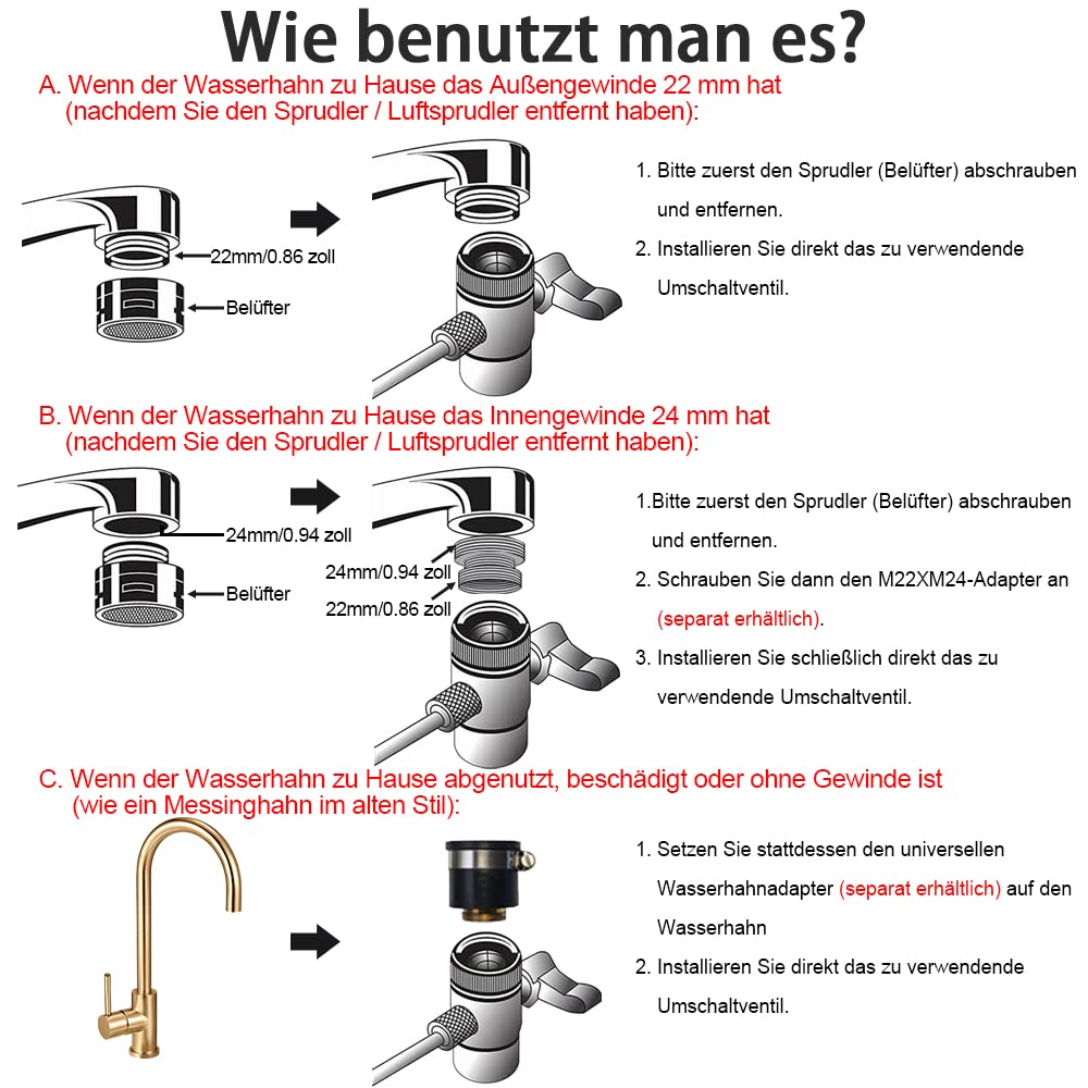 Sollte Ihre Armatur ein 24 mm Innengewinde besitzen, ist die Nutzung mit einem gängigen M22 auf M24 Adapter problemlos möglich. Für Armaturen ohne Gewinde, aber mit einem Durchmesser zwischen 14 und 22 mm, empfiehlt sich ein Universaladapter, der separat erhältlich ist. Sobald das Ventil montiert ist, wird der 1/4 Zoll Außendurchmesser Kunststoffschlauch Ihres RO- oder Tischfilters einfach aufgesteckt und mit einer Schlauchschelle befestigt.