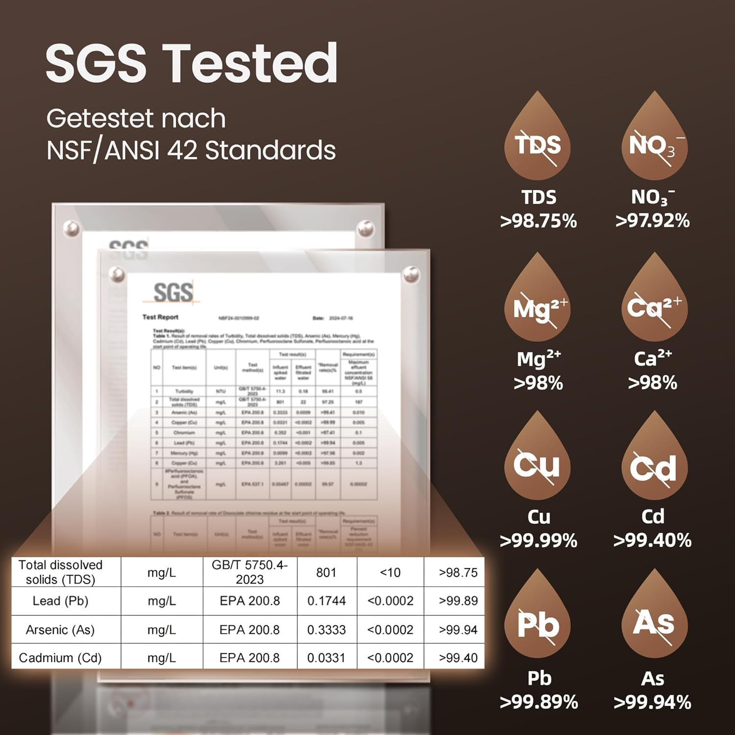 - 8-Stufen-Filtration für 99,99 % Reinheit – entfernt Blei, Schwermetalle, Nitrate, Bakterien und Viren