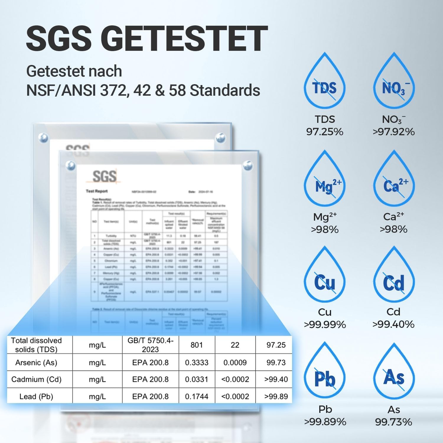 Jede dieser Stufen wurde von SGS nach NSF/ANSI Standard 58 geprüft – ein unabhängiges Gütezeichen, das weltweit als Maßstab für Trinkwassersicherheit gilt. Das Ergebnis: Wasser, das nicht nur sauber, sondern lebendig ist.