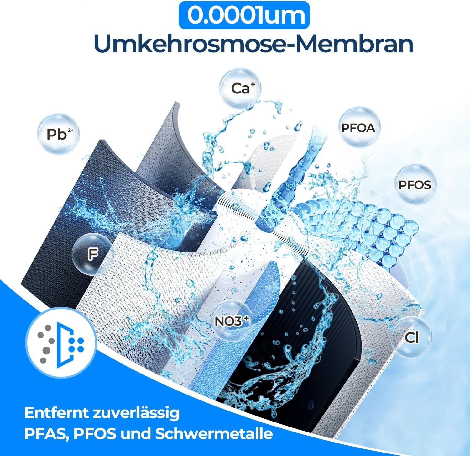 - Effektive Entfernung von PFAS, PFOA, PFOS, Schwermetallen, Nitrat, Fluorid, Chlor
