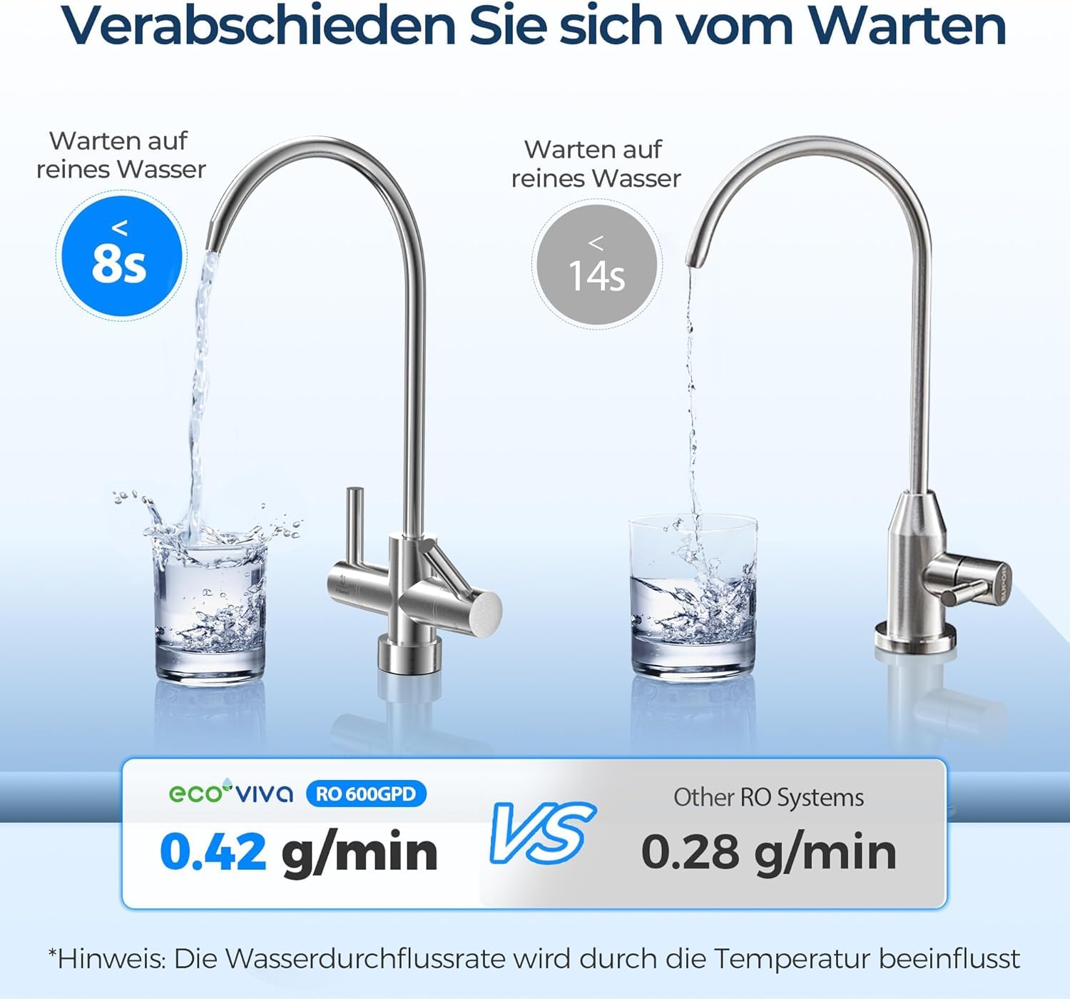 Mit einer Tagesleistung von 600 Gallonen (ca. 2.270 Liter) ist die Ecoviva Osmoseanlage für Großfamilien, Home-Office-Nutzer oder mehrpersonenhushalte konzipiert, in denen täglich großer Wasserbedarf herrscht. Dank eines integrierten Hochleistungs-Boosterpumps und einer vergrößerten Membranfläche erreicht das System eine Durchflussrate, die ein Glas in nur 8 Sekunden füllt – das ist bis zu 370 % effizienter als konventionelle Systeme mit 3:1-, 4:1- oder 5:1-Abwasserverhältnissen.