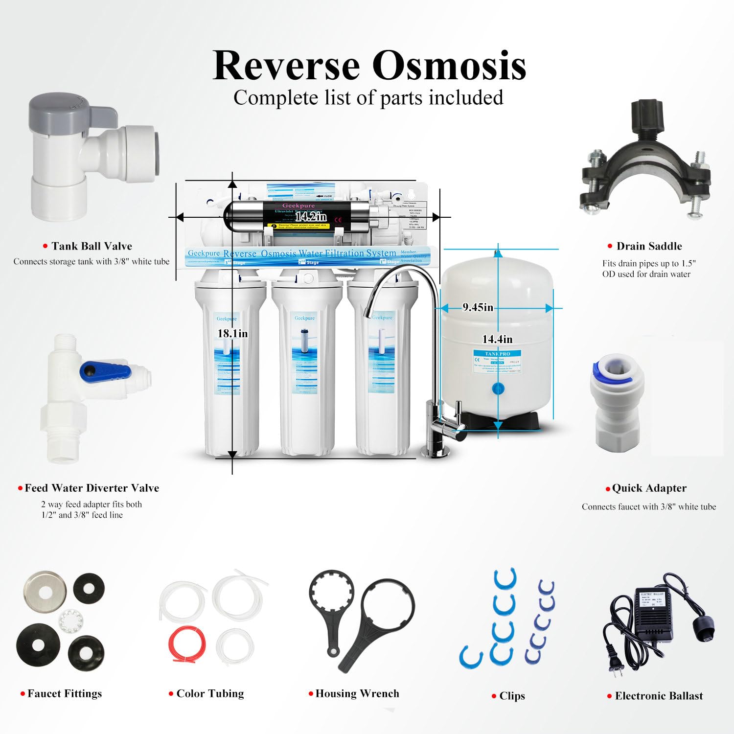 Jedes Bauteil des Geekpure RO6-UV wurde unter strengen Qualitätsstandards ausgewählt, um maximale Langlebigkeit und Sicherheit zu gewährleisten. Alle Schläuche, Schnellsteckverbinder, der Speichertank und die Umkehrosmose-Membran sind NSF-zertifiziert, was für gesundheitliche Unbedenklichkeit und technische Zuverlässigkeit steht. Die Rohrleitungen in den Größen 1/4″ und 3/8″ sind bruchsicher, temperaturbeständig und korrosionsfrei – ideal für den langfristigen Einsatz unter der Spüle.