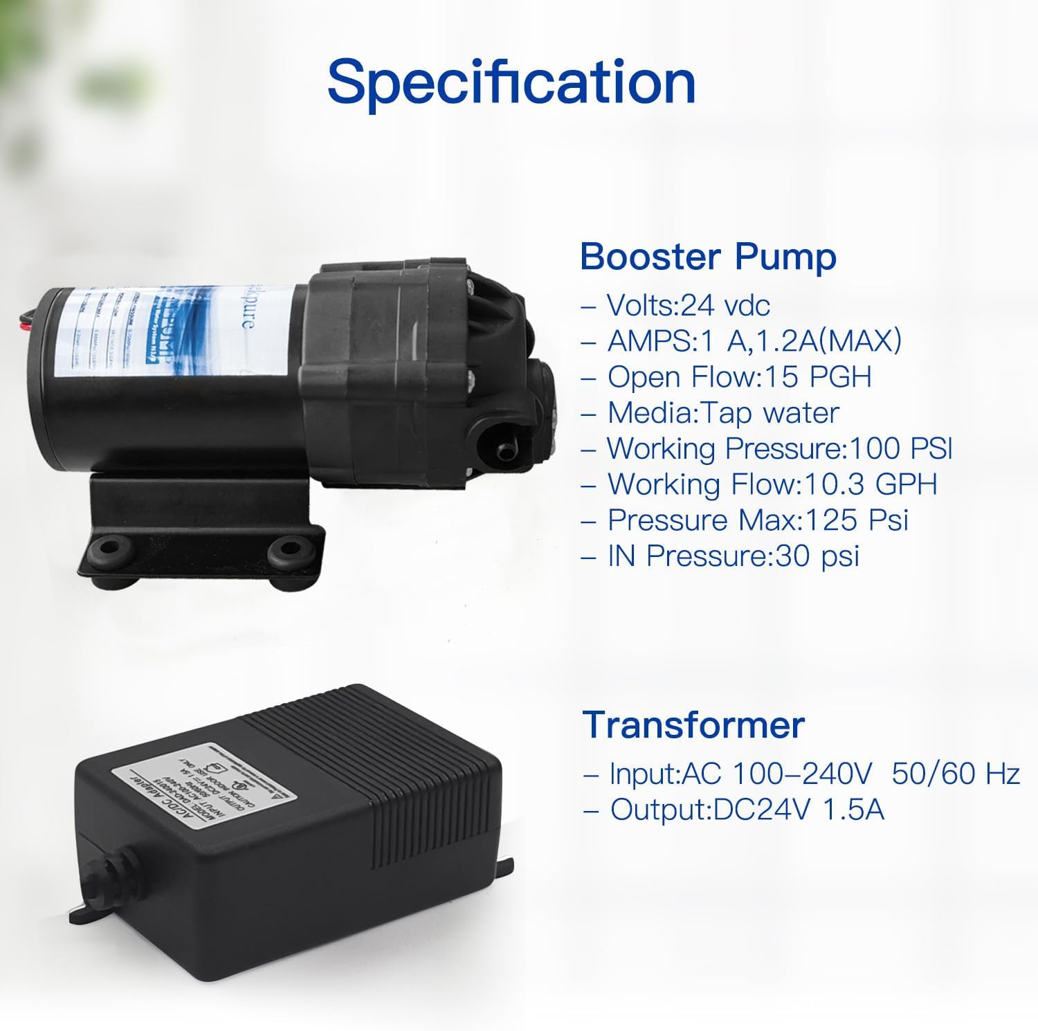 • 5-Stufen-Umkehrosmose-System mit Boosterpumpe für niedrigen Wasserdruck (< 40 PSI)