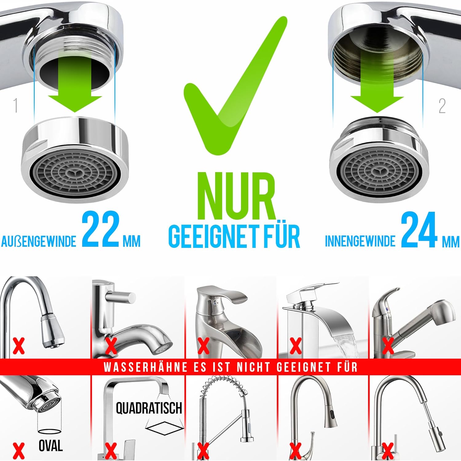 - Speziell für Küchenarmaturen mit 22 mm Außengewinde und 24 mm Innengewinde
