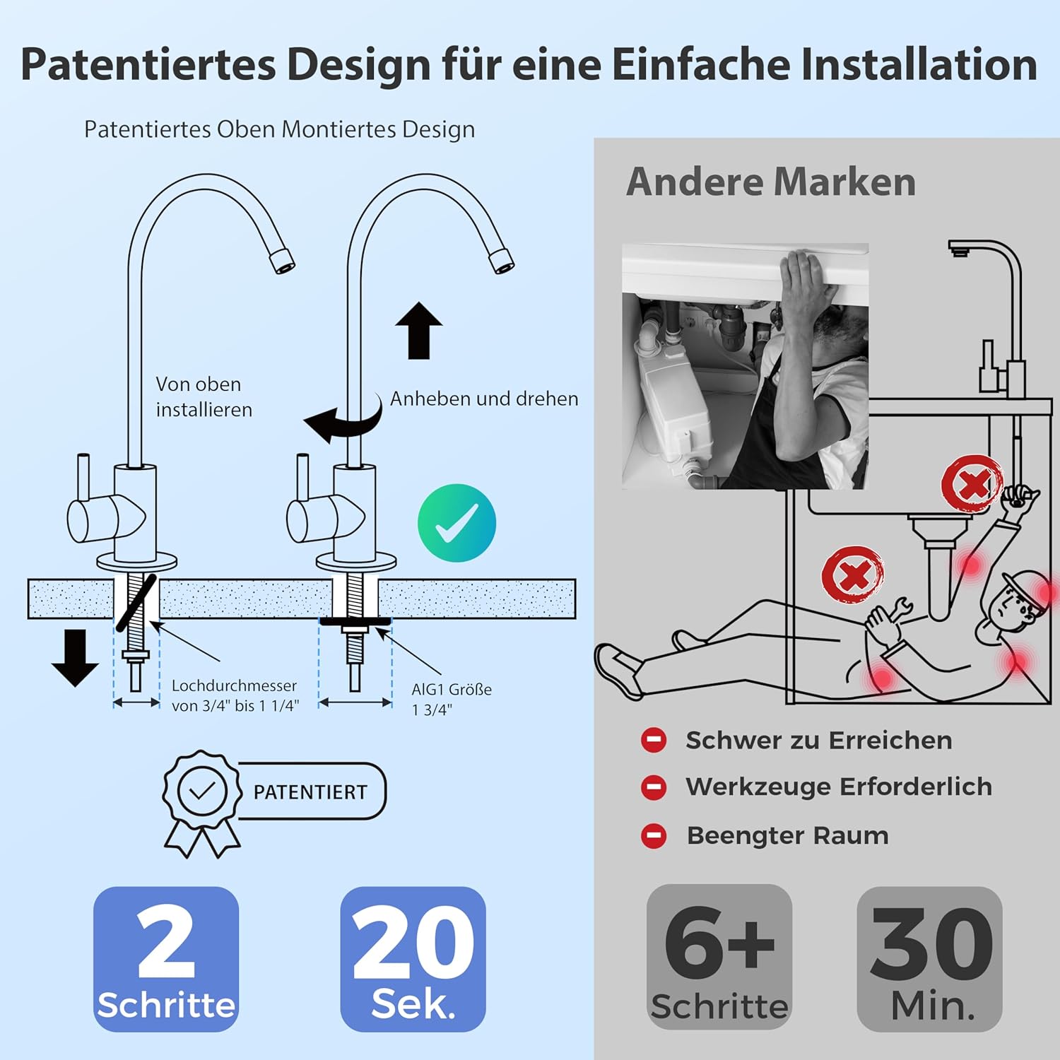 Die Installation des RCC7AK ist für handwerklich begabte Heimwerker ohne Fachkenntnisse durchführbar. Im Lieferumfang sind alle notwendigen Komponenten enthalten: Schläuche, Anschlüsse, Montagehalterungen, ein eigenständiger Wasserhahn für das gereinigte Wasser und detaillierte Installationsanleitungen. Zusätzlich stehen Ihnen online umfassende Video-Tutorials zur Verfügung, die Schritt für Schritt durch den Aufbau führen.