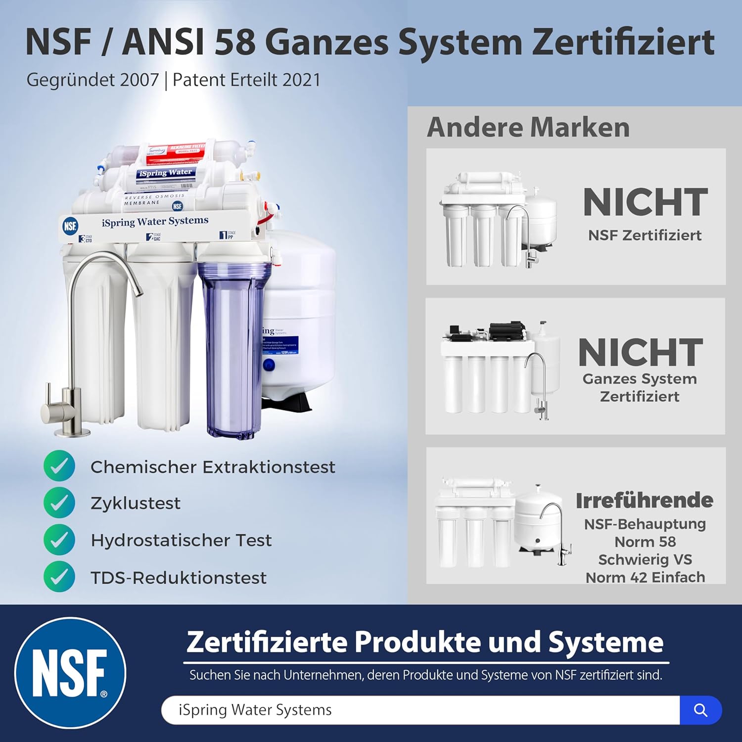 Sicherheit steht bei iSpring an erster Stelle. Das RCC7AK-System erfüllt strengste Qualitätsstandards und ist zertifiziert nach NSF/ANSI 58, der international anerkannten Norm für Umkehrosmose-Systeme. Diese Zertifizierung garantiert, dass das System tatsächlich die von iSpring deklarierten Schadstoffe in dem angegebenen Maß entfernt – unabhängig von der regionalen Wasserqualität.