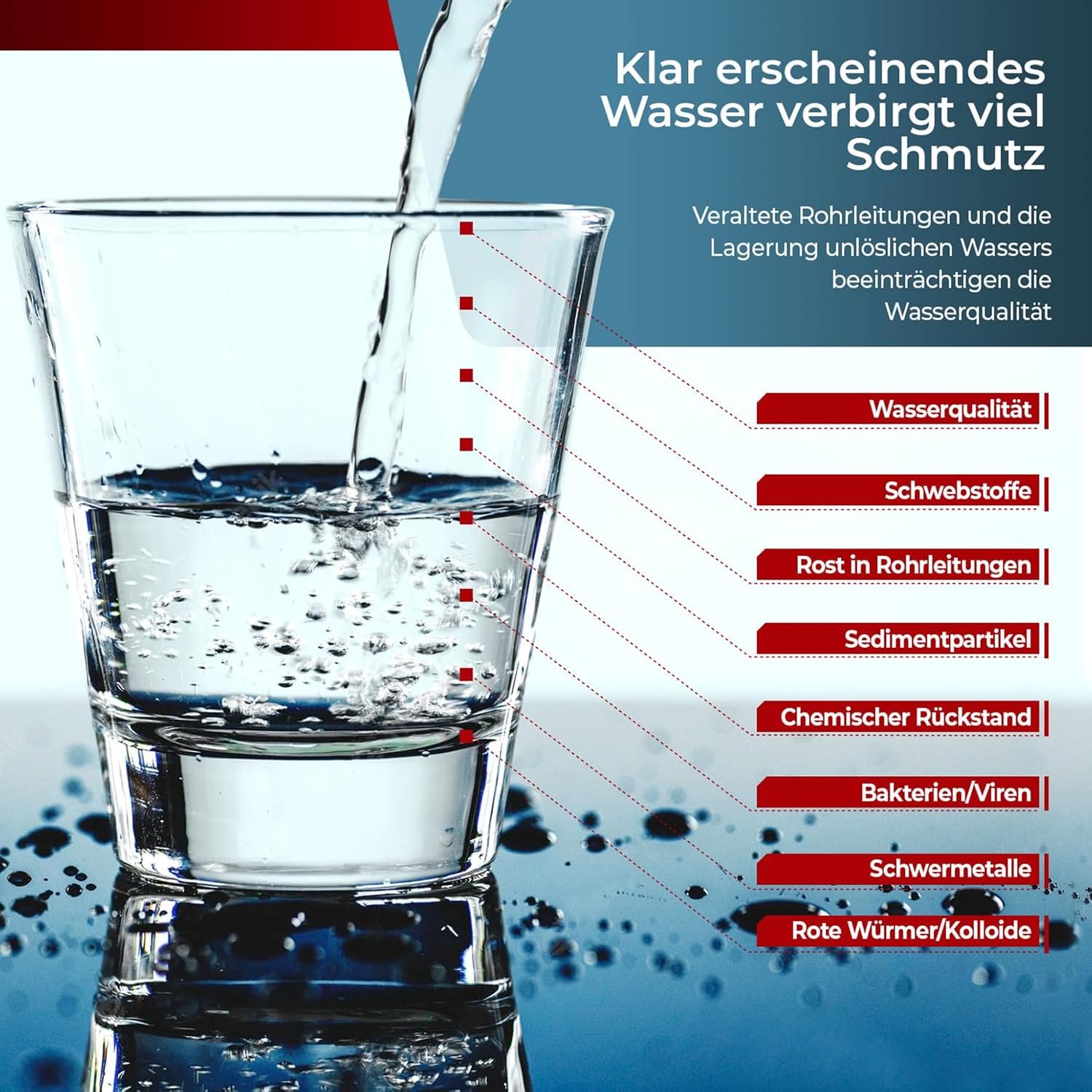 • Entfernt bis zu 99 % aller Wasserinhaltsstoffe, Partikel und Verunreinigungen