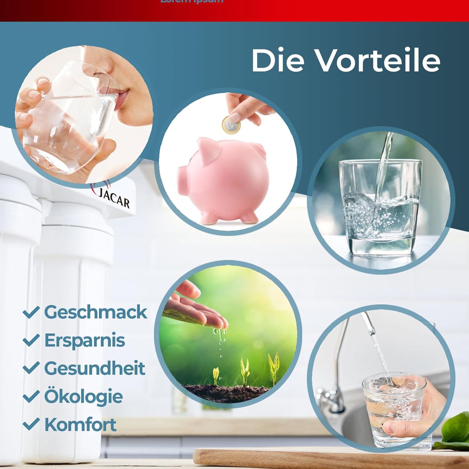Wassersicherheit ist kein Thema, das man auf die leichte Schulter nehmen sollte. Mikroplastik, Schwermetalle, Nitrate oder Keime können in manchen Regionen das Leitungswasser belasten. Das JACAR Osmosis System Filter Set arbeitet nach dem Prinzip der Umkehrosmose und bietet eine mehrschichtige Barriere gegen diese Gefahren. Die Kombination aus Sedimentfiltern, Aktivkohle und feinporösen Membranen sorgt für eine nahezu vollständige Reinigung des Wassers.