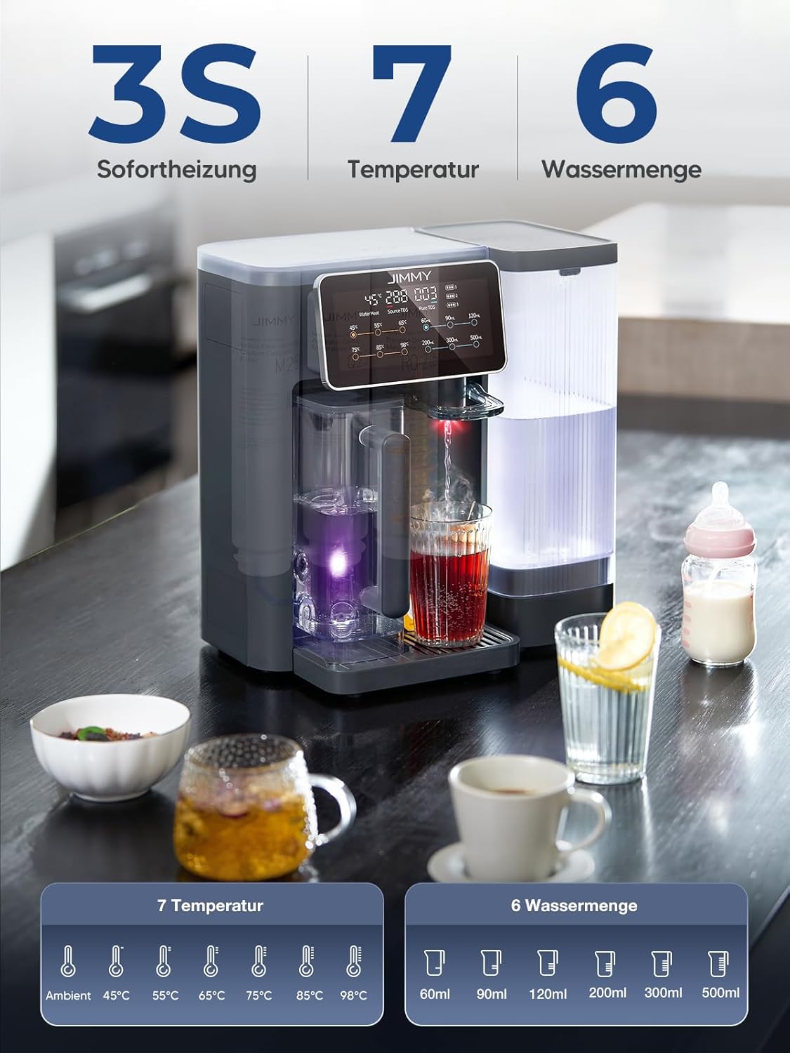 Der Jimmy R9 hebt den Wasserkonsum auf ein neues Niveau des Komforts. Statt mühsam zu warten, bis das Wasser kocht, steht innerhalb von drei Sekunden kochendheißes Wasser zur Verfügung – dank des integrierten 3S-Heizsystems. Die Temperatur lässt sich präzise in sieben Stufen zwischen 45°C und 98°C einstellen. Das bedeutet: 45°C für empfindliche Kräutertees, 65°C für grünen Tee, 85°C für Kaffee und 98°C für schwarzen Tee oder instant Suppen. Jede Temperatur wird exakt gehalten, sodass weder zu kaltes noch zu heißes Wasser die Aromen beeinträchtigt.