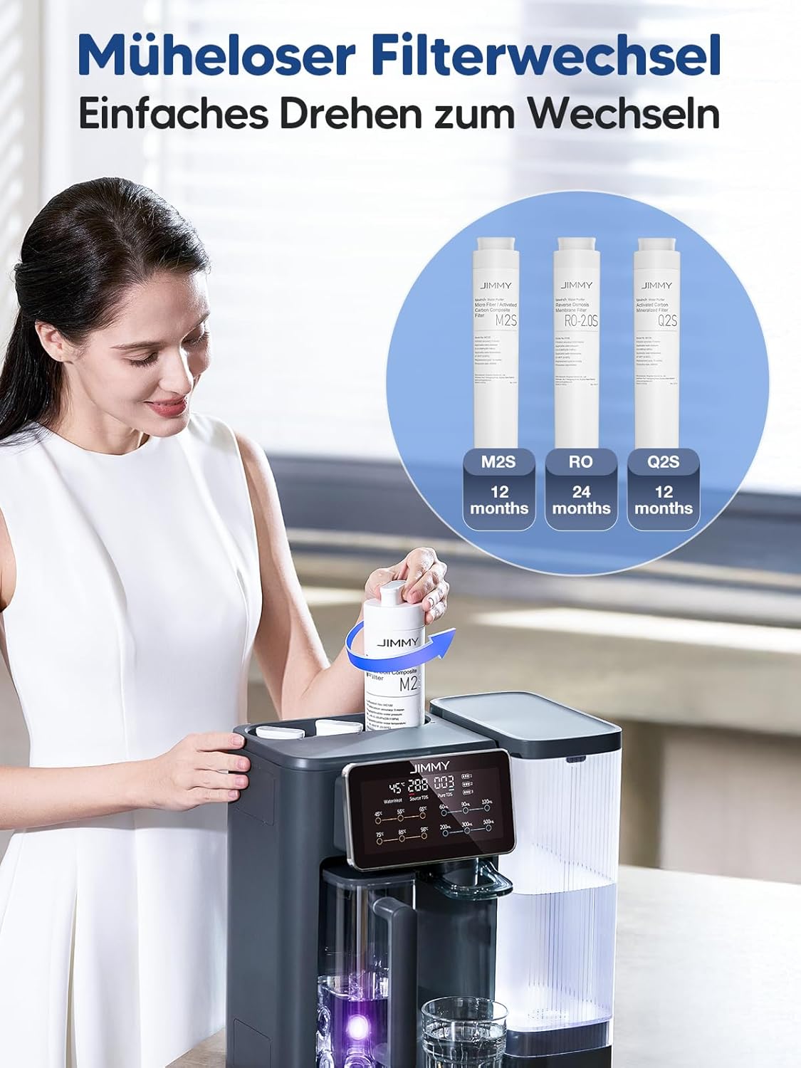 Der Jimmy R9 macht Wartung zur Selbstverständlichkeit – nicht zur Pflichtübung. Dank des rotierenden Filterwechselsystems lassen sich alle Filter im Handumdrehen wechseln – ganz ohne Werkzeug. Jede Filterstufe ist farblich gekennzeichnet und mit einem klaren Symbol versehen, sodass Verwechslungen ausgeschlossen sind. Der RO-Filter hält bis zu 24 Monate oder 3.600 Liter – je nach lokaler Wasserqualität. Die Kombifilter (Sediment + Aktivkohle) werden alle 12 Monate oder nach 1.800 Litern empfohlen. Das Display erinnert automatisch rechtzeitig an den Wechsel und zeigt den Verschleißgrad grafisch an.