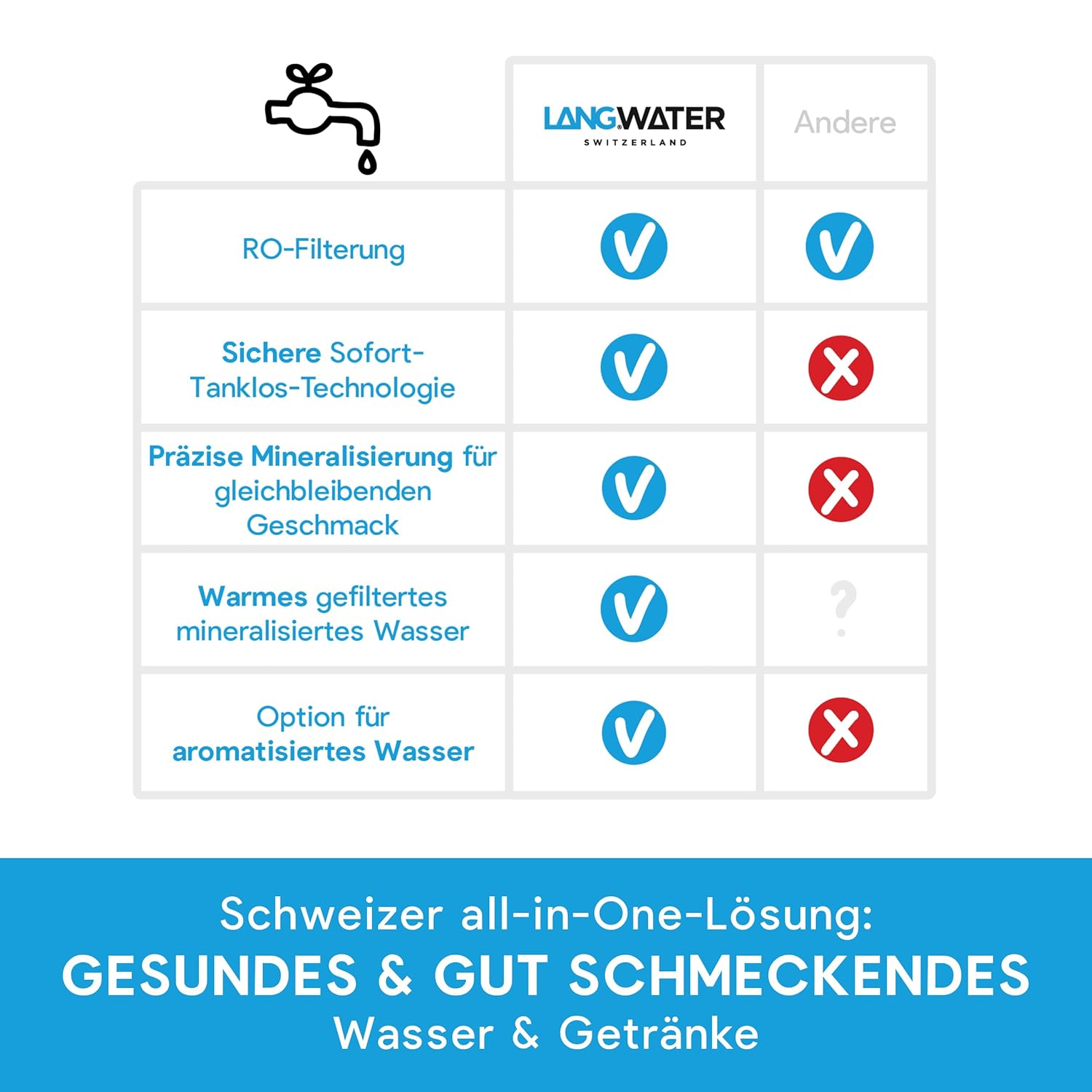 Entwickelt für Familien, die Wert auf Sicherheit legen, für Genießer, die den Unterschied schmecken, und für Umweltbewusste, die Plastik vermeiden möchten – das LANG Water Filter & Mineralisation System ist die kluge Antwort auf die Herausforderungen des modernen Alltags. Es liefert Premium-Wasser zum Preis von nur 12 Cent pro Liter, spart Platz durch seine kompakte Bauweise und schont die Umwelt durch geringeren Wasserverbrauch und den Verzicht auf Einwegflaschen.