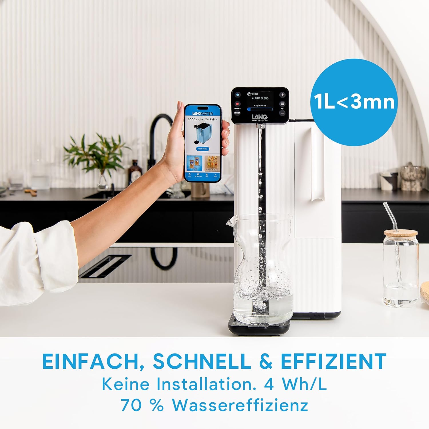 Der Alltag mit dem LANG System wird spürbar einfacher und angenehmer. Dank der „Plug & Drink“-Technologie ist keine Installation erforderlich – einfach anschließen, Wasserzufuhr anschließen und innerhalb weniger Minuten startklar. Die integrierte Selbstreinigungsfunktion reduziert den Wartungsaufwand auf ein Minimum. Per App oder Touchscreen können Sie die Wasserhärte, den Mineralgehalt und die Geschmacksintensität individuell einstellen – ob Sie ein weiches, nahezu natriumfreies Wasser für den Morgen Tee bevorzugen oder ein mineralreicheres Wasser nach dem Sport.