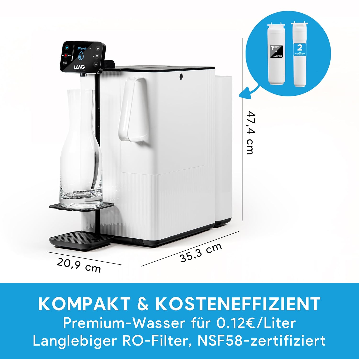 Jedes Bauteil des LANG Water Filter & Mineralisation System wurde unter strengen Maßstäben für chemische und bakterielle Sicherheit geprüft. Das Gehäuse aus hochwertigem, BPA-freiem Kunststoff in elegantem Weiß überzeugt nicht nur optisch, sondern ist strapazierfähig, leicht zu reinigen und altersbeständig. Die kompakten Abmessungen von 35 x 21 x 47 cm und das Gewicht von 9 Kilogramm sorgen für Standfestigkeit, ohne unnötig Platz zu verbrauchen.