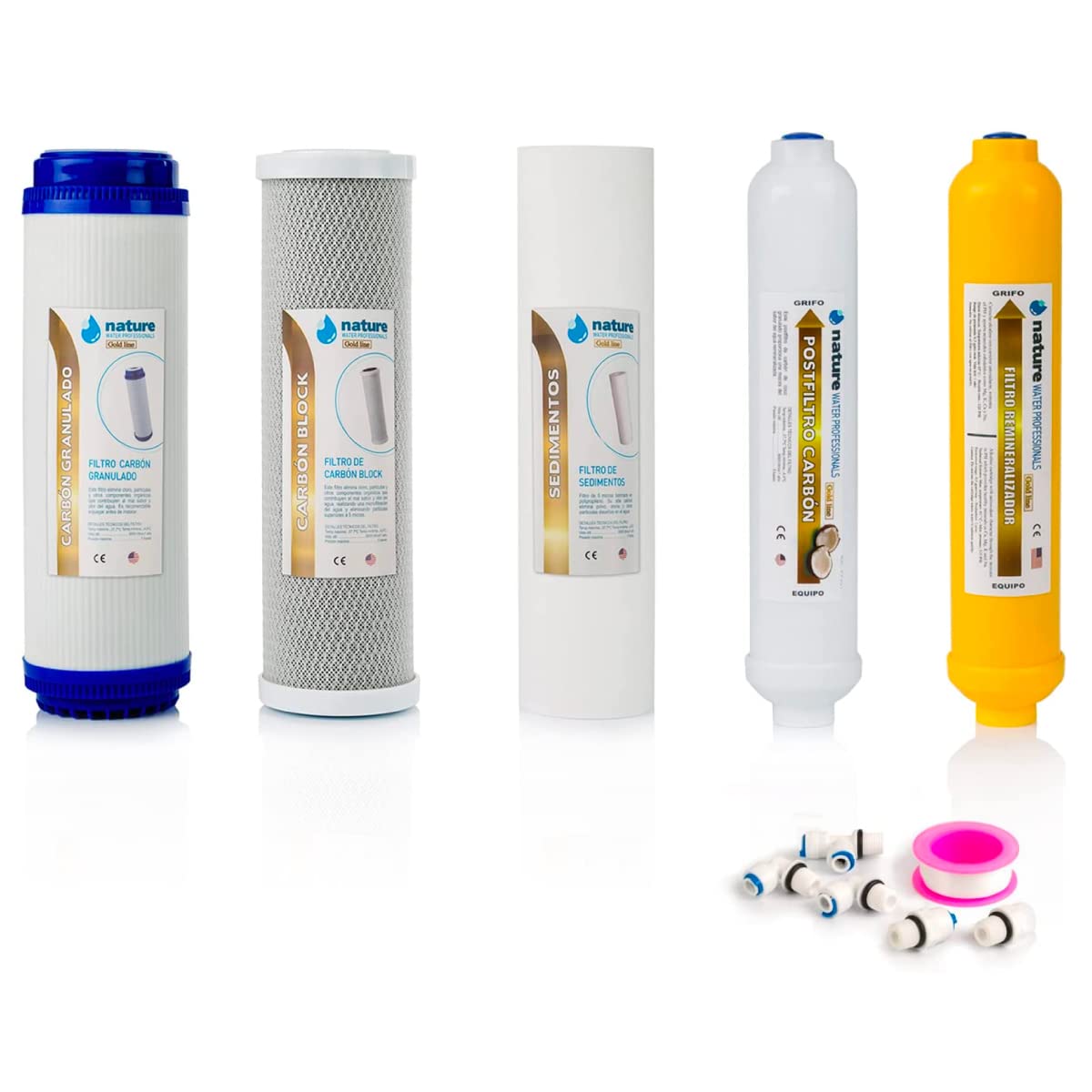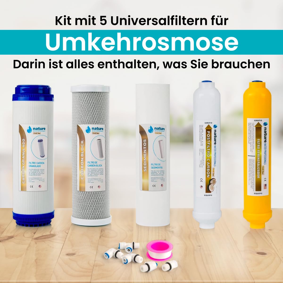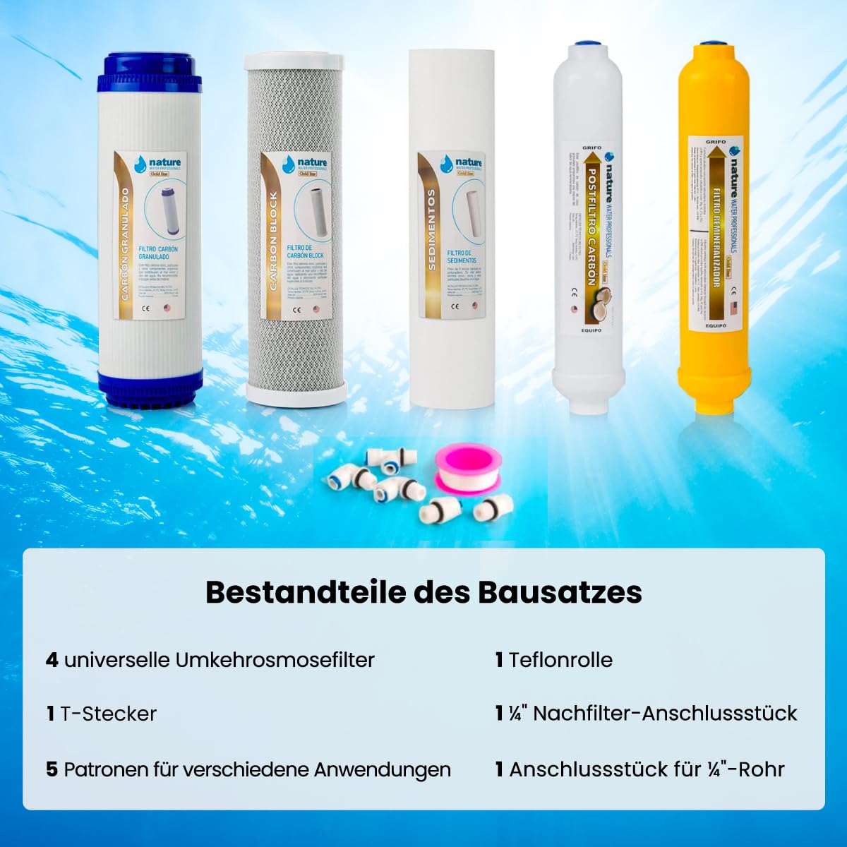 Premium 5-Filter-Set für 6-stufige Umkehrosmose-Anlagen – Gold-Line Ersatzfilter von Nature Water Professionals mit Teflon, „T“-Stück und Anschlüssen