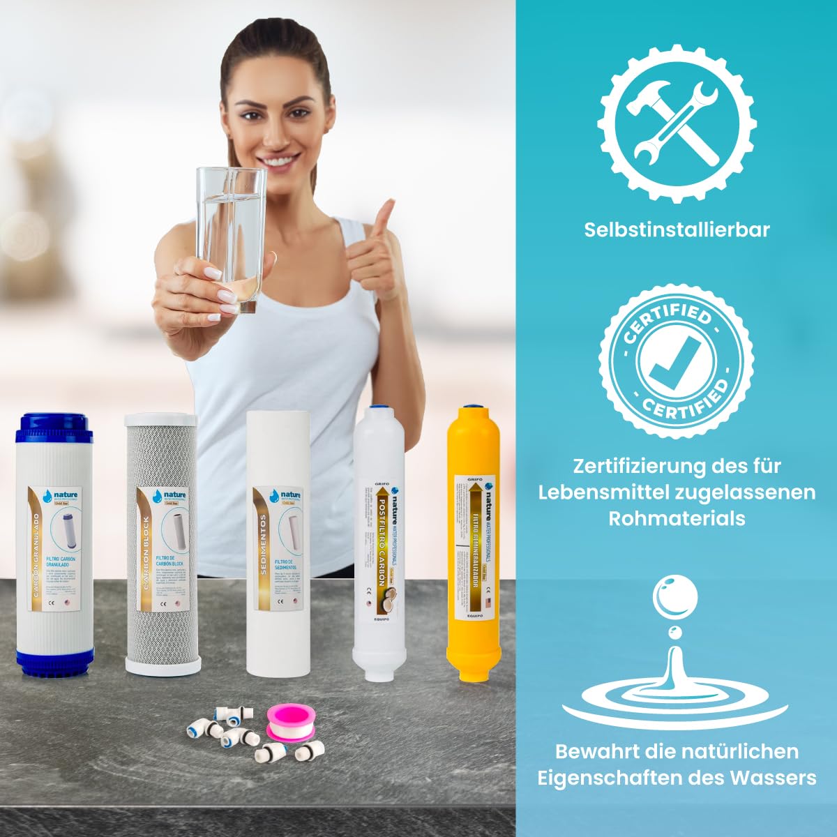 Wasser ist die Quelle des Lebens – doch nur reines, sauberes Wasser schenkt Ihrer Familie echte Vitalität und langfristige Gesundheit. Um dieses Qualitätsniveau zu erreichen, bedarf es eines Filtersystems, das nicht nur höchsten technischen Ansprüchen genügt, sondern auch über Jahre hinweg zuverlässig und effizient arbeitet. Mit dem 5-Filter-Set Gold-Line von Nature Water Professionals erhalten Sie ein maßgeschneidertes Ersatzfilter-Kit, das speziell für 6-stufige Umkehrosmose-Anlagen entwickelt wurde und alle Komponenten enthält, die für einen perfekten Austausch und eine optimale Wasserqualität notwendig sind. Dieses Set ist mehr als nur ein Ersatz – es ist ein Versprechen auf Reinheit, Klarheit und langanhaltende Leistung.