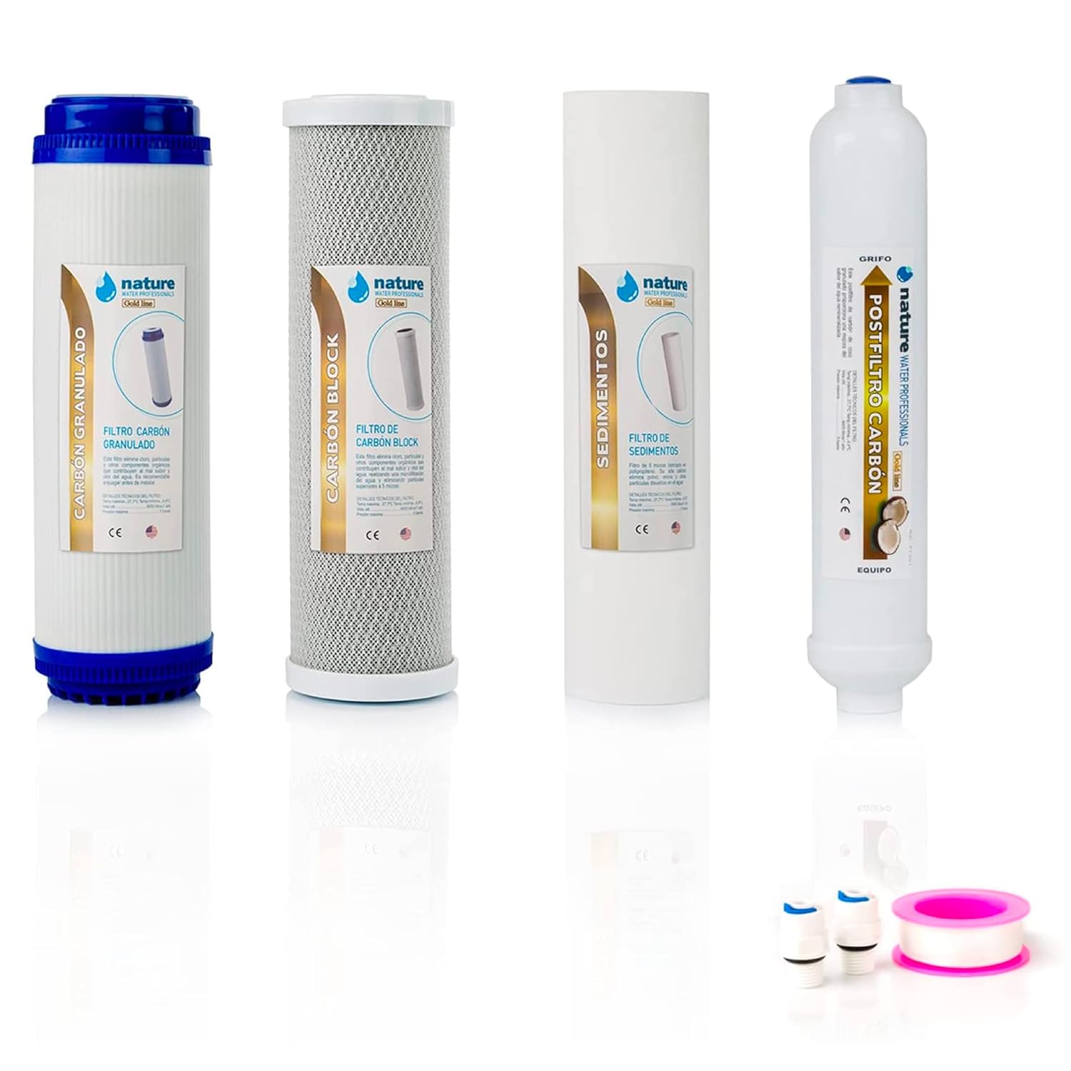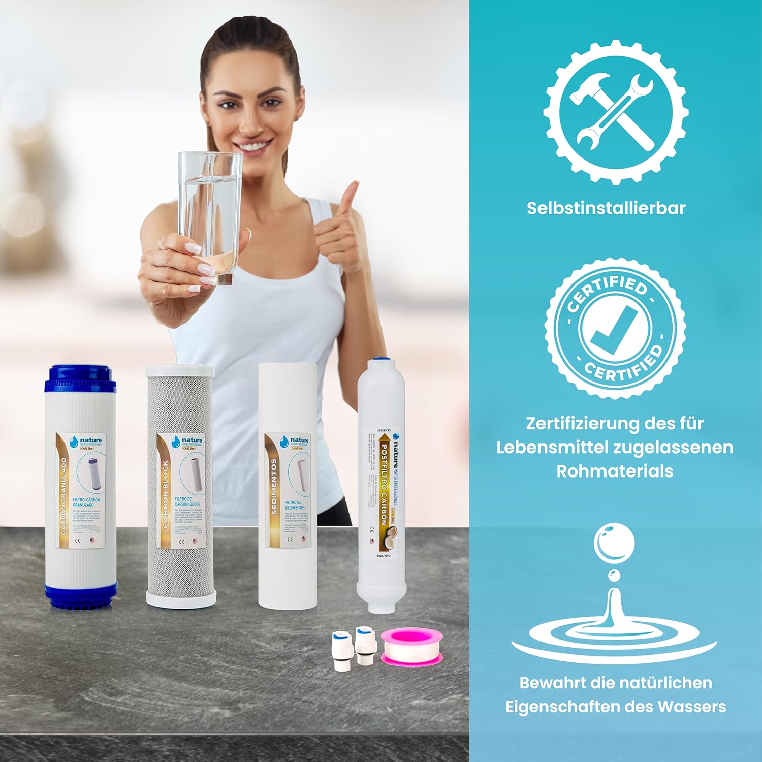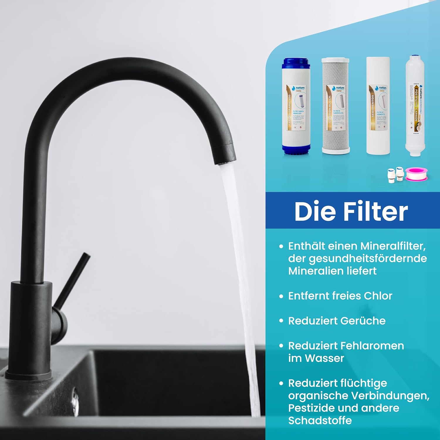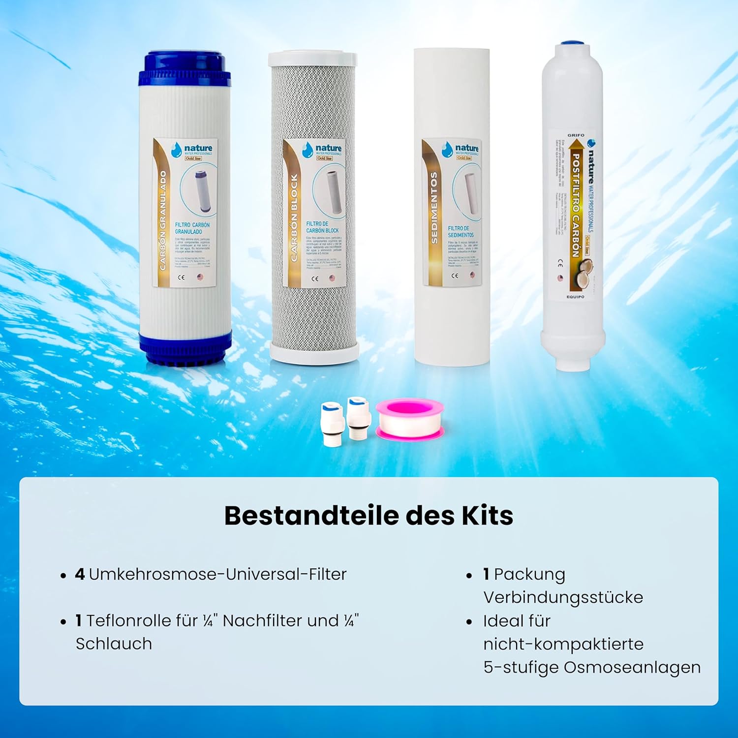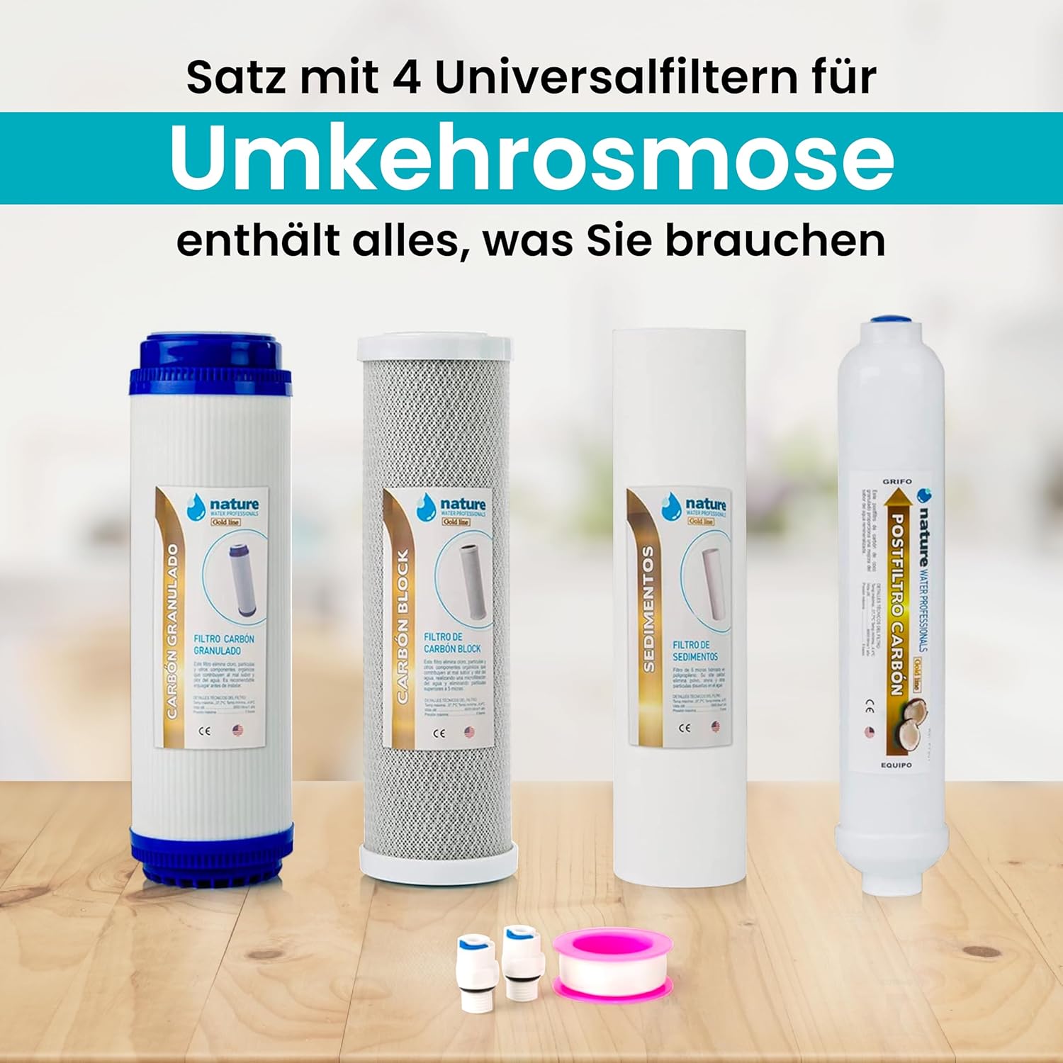 NATURE WATER PROFESSIONALS – Gold Line 5-Stufen Umkehrosmose Filterset (4-teilig) mit Teflonband & Anschlusskomponenten – Höchste Reinigungsleistung für reines Trinkwasser zu Hause