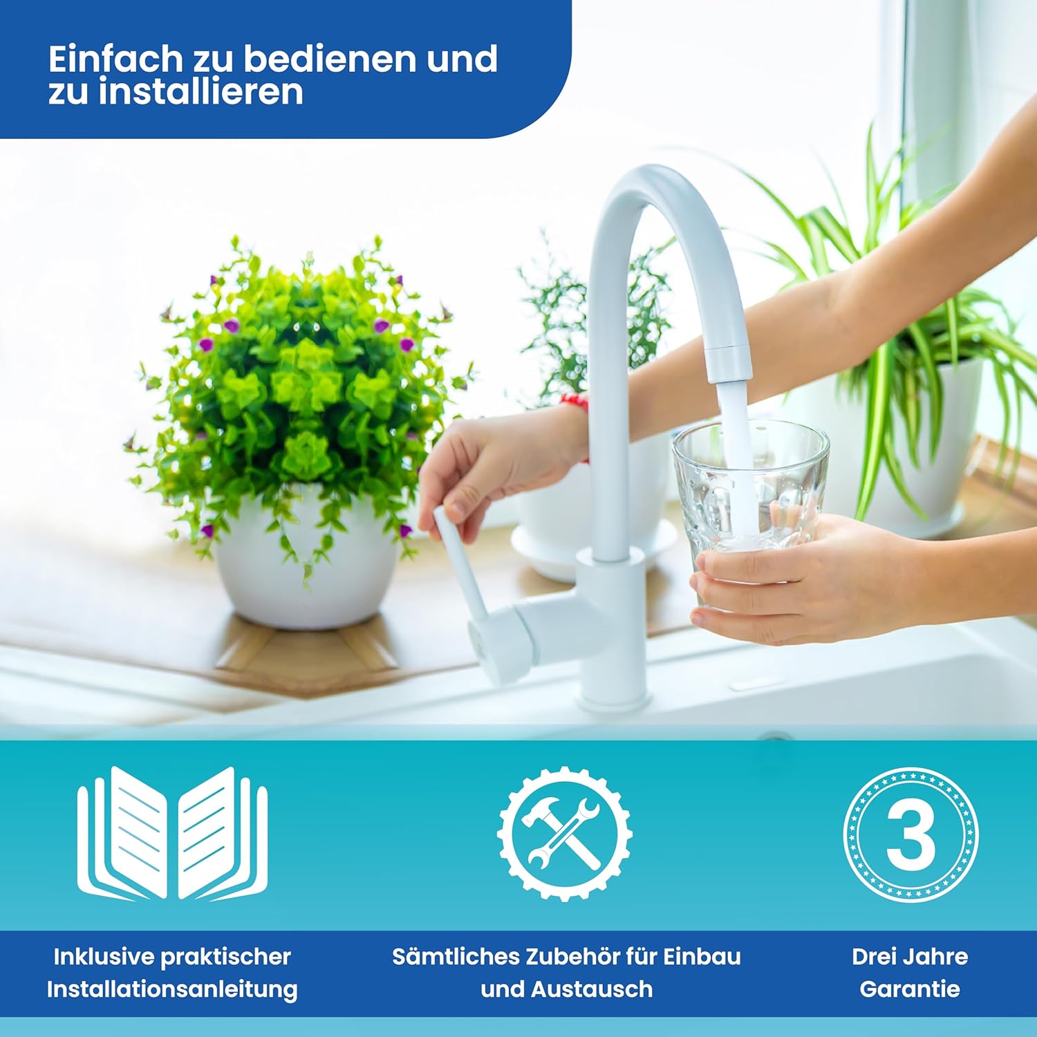 Ob in der Großstadt mit hartem Wasser oder im ländlichen Gebiet mit unregelmäßiger Wasserqualität – dieses Filterset ist Ihr zuverlässiger Partner für kristallklares, geschmacksneutrales Osmosewasser direkt aus dem Hahn. Kein mühsames Tragen schwerer Wasserkisten mehr, kein Plastikabfall durch Einwegflaschen, kein Zweifeln an der Wasserqualität. Mit diesem System holen Sie sich die Reinheit einer hochmodernen Wasseraufbereitungsanlage in Ihre Küche – diskret, effizient und nachhaltig.