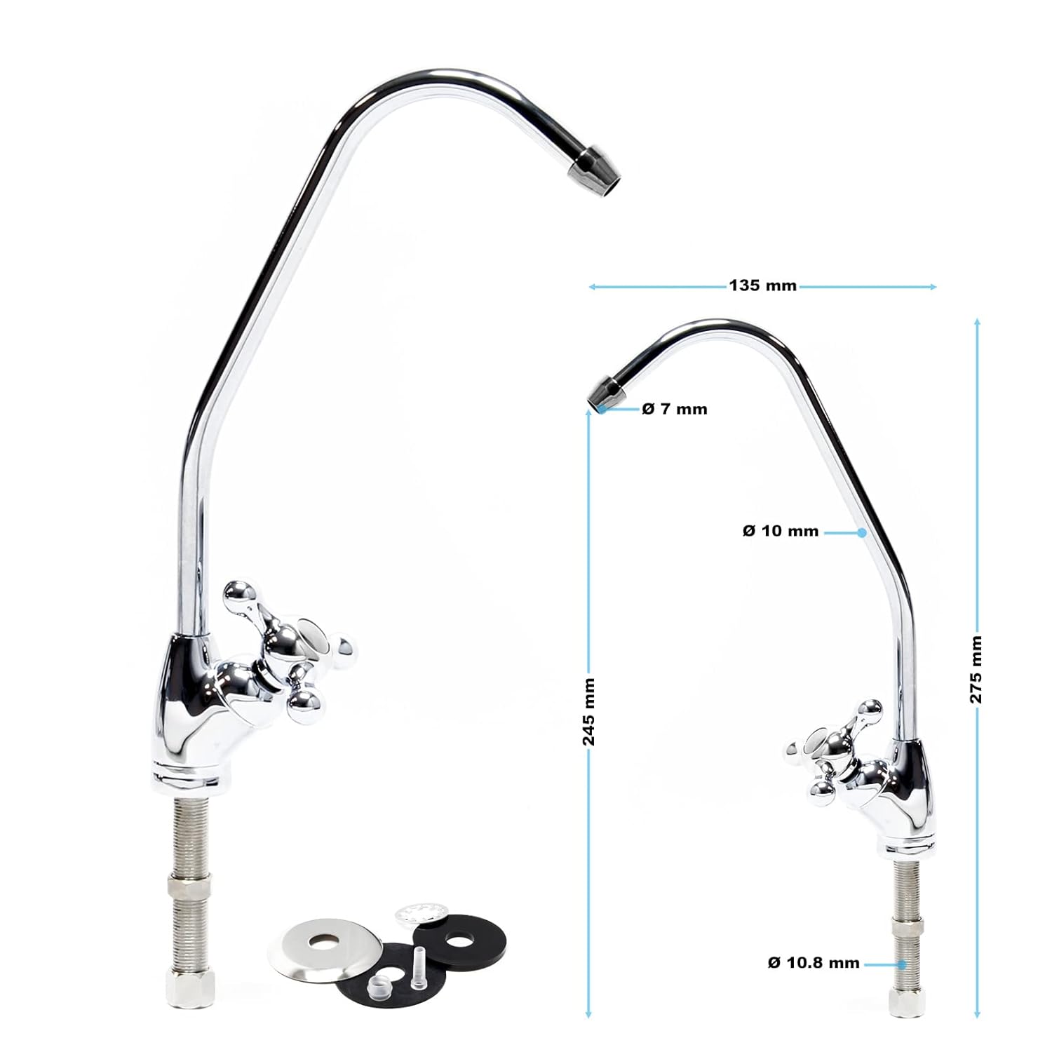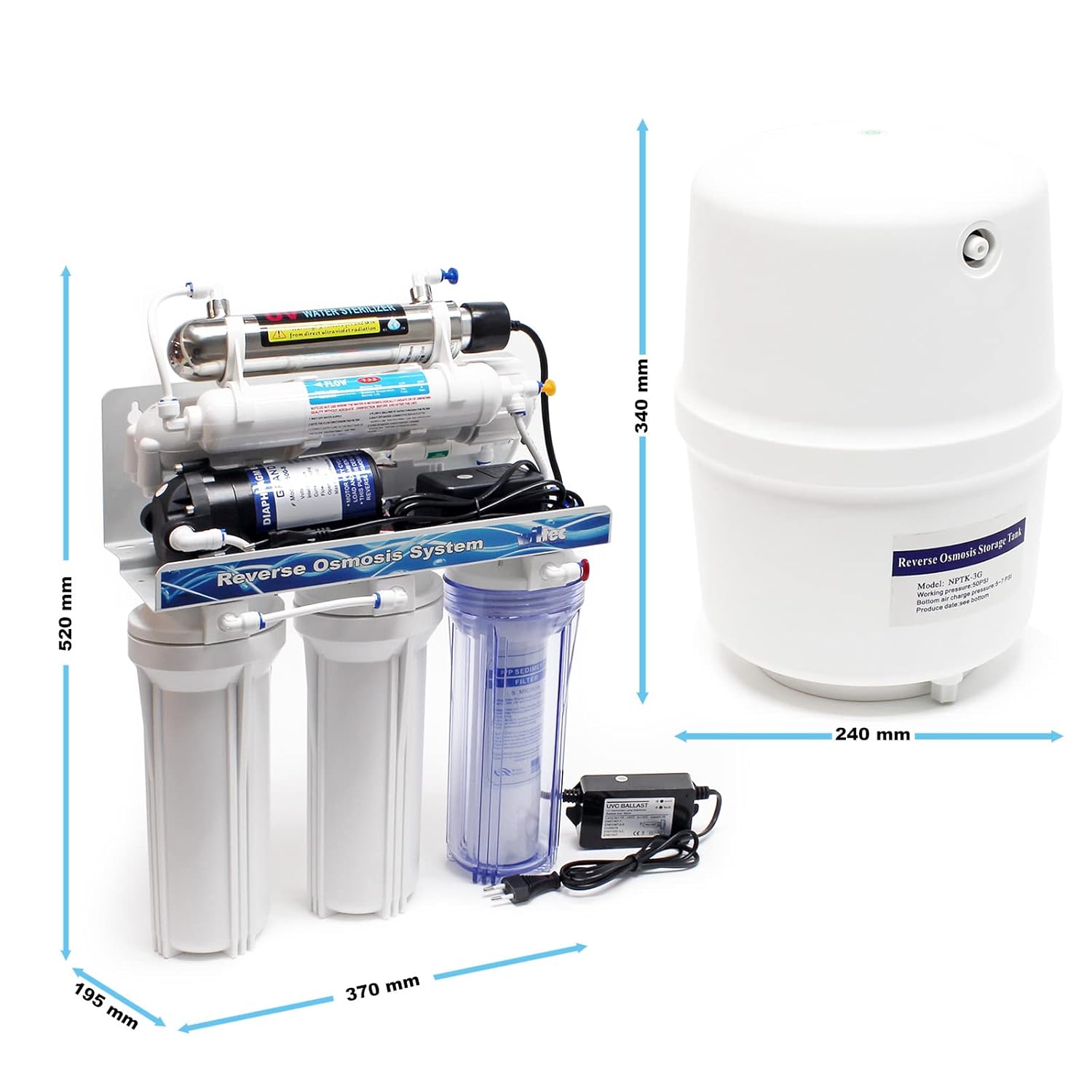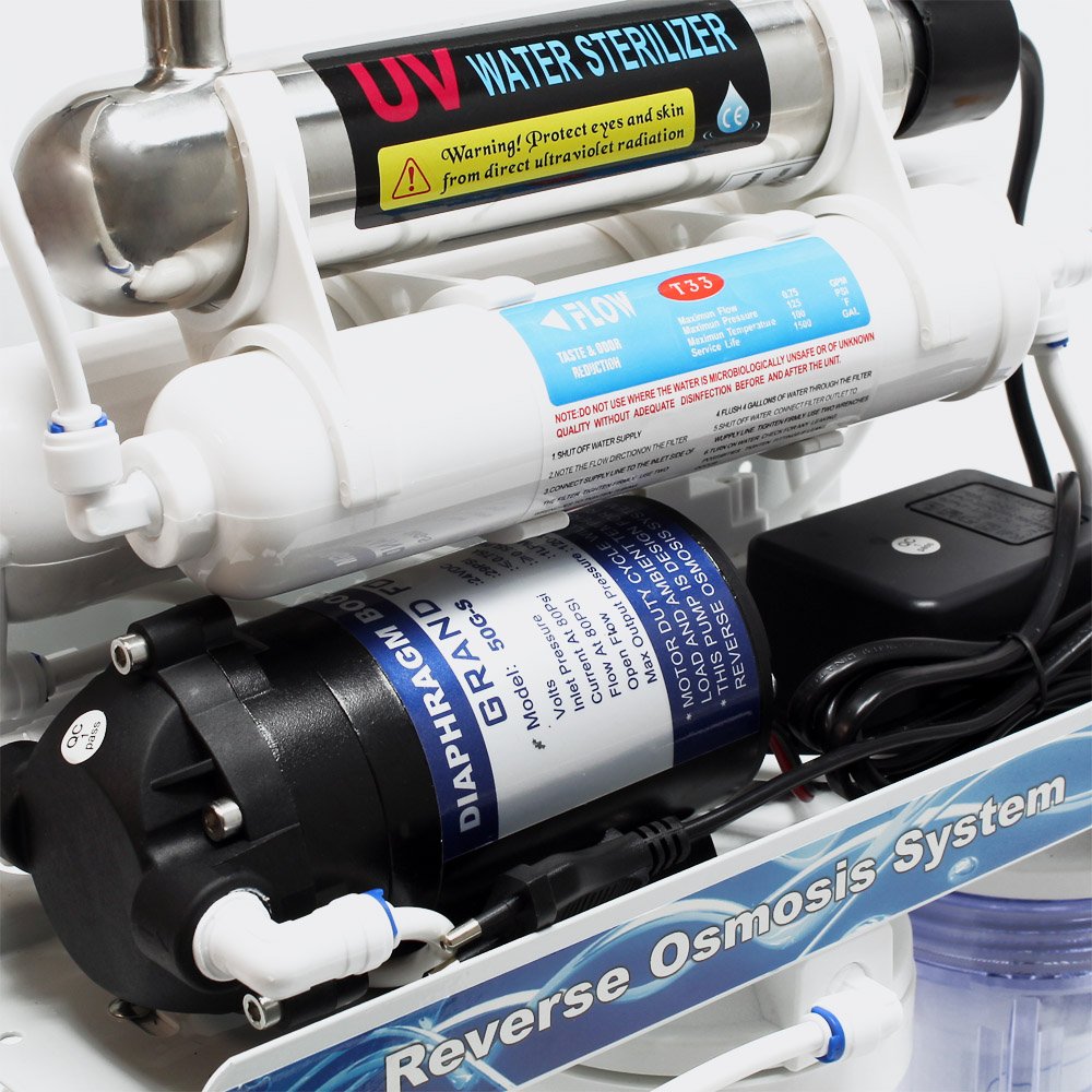 - Filterstufen: 6 (Sediment 5µ, Aktivkohle, Sediment 1µ, RO-Membran, Post-Filter, UV)