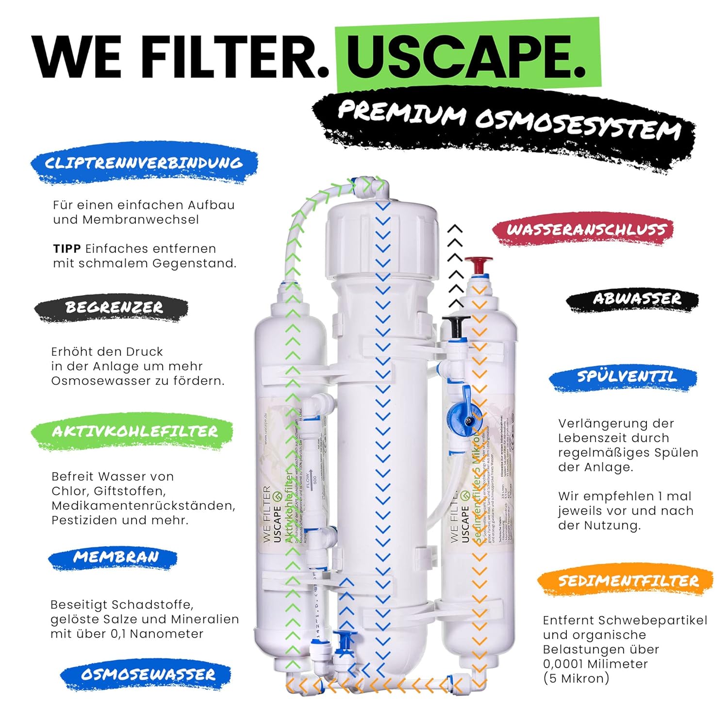 • Filterstufen: Sedimentfilter (5 µm), Aktivkohlefilter, RO-Membran