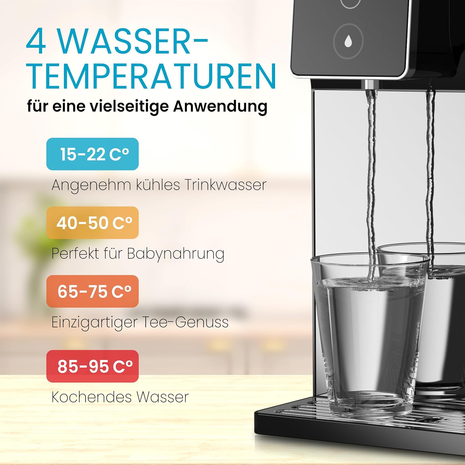 - 4 wählbare Wassertemperaturen: kalt, warm, heiß, kochend