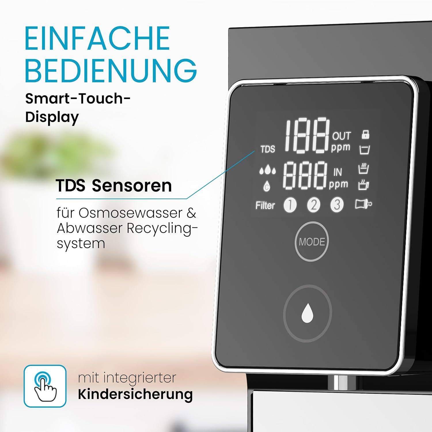 - Integriertes Smart-Touch-Display mit TDS-Anzeige