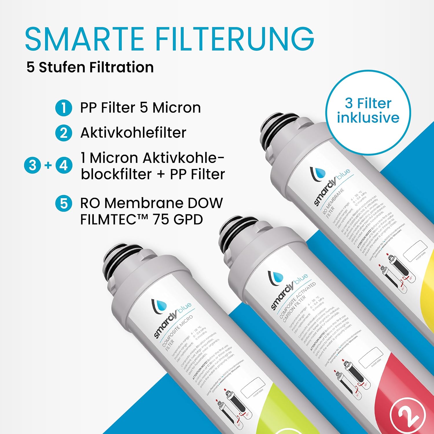 - Filtertyp: 5-stufig (Sediment, Aktivkohle, RO-Membran, Post-Carbon, Mineral)