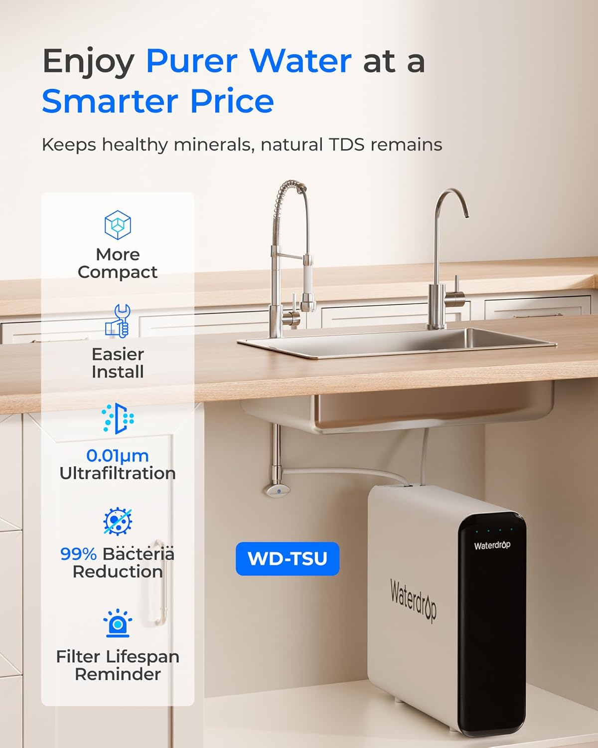 Waterdrop TSU-W Ultrafiltrations-Unterschrank-Wasserfiltersystem – 3-stufige Premium-Filterung mit 0,01 µm Membran, Integrierten Wasserwegen & Intelligenten Anzeigen für reines, gesundes Trinkwasser zu Hause