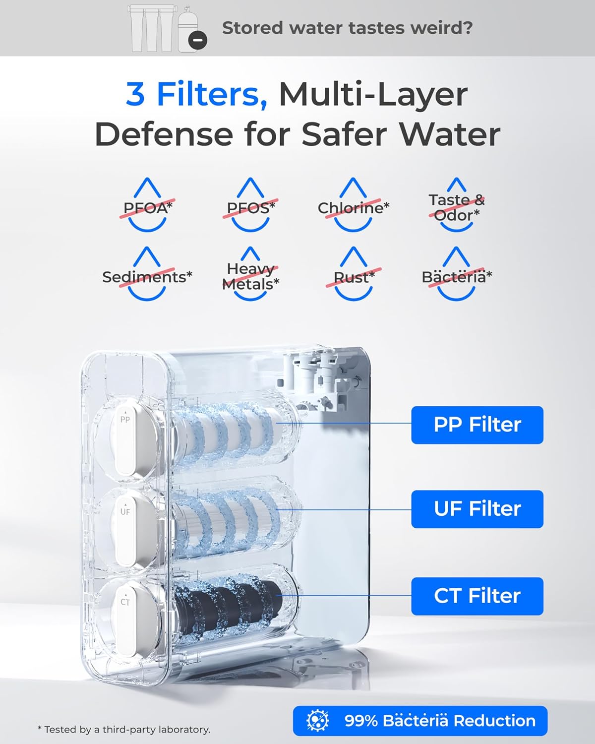 Jedes Bauteil des Waterdrop TSU-W ist auf Langlebigkeit, Sicherheit und optimale Leistung ausgelegt. Das Gehäuse aus hochwertigem, schlagfestem Kunststoff in elegantem Weiß passt sich harmonisch in jede Küchenlandschaft ein und widersteht Feuchtigkeit, Temperaturschwankungen und mechanischen Belastungen. Im Inneren sorgen drei präzise abgestimmte Filterstufen für maximale Reinigungskraft: Zunächst filtert ein PP-Filter (6‑Monats-Lebensdauer) grobe Partikel wie Sand, Rost und Sedimente aus. Danach reduziert ein CT-Filter (12‑Monats-Lebensdauer) effektiv Restchlor, organische Verbindungen und unangenehme Gerüche. Den Abschluss bildet die hochentwickelte 0,01 µm Ultrafiltrationsmembran, die nahezu alle schädlichen Partikel, Bakterien und Kryptosporidien zurückhält – ohne die wertvollen Mineralien zu entfernen.