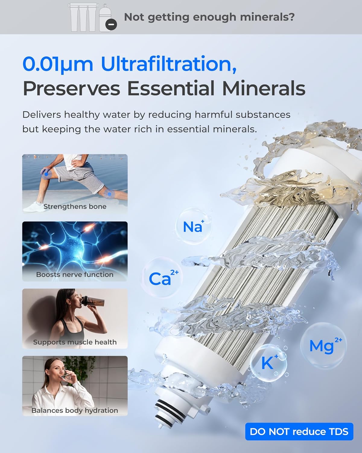 In puncto Sicherheit geht das Waterdrop TSU-W keine Kompromisse ein. Die 0,01 µm Ultrafiltrationsmembran bildet eine physische Barriere gegen Partikel, Bakterien, Zysten und andere mikrobiologische Kontaminanten, die das Leitungswasser belasten können. Gleichzeitig reduziert das System effektiv Schwermetalle wie Blei und Quecksilber, die in älteren Leitungen oder aus industriellen Quellen stammen können. Im Gegensatz zu Umkehrosmose-Systemen entfernt es jedoch keine wertvollen Mineralien wie Kalzium, Magnesium, Kalium oder Natrium – ein entscheidender Vorteil für die tägliche Mineralzufuhr und den Geschmack des Wassers.