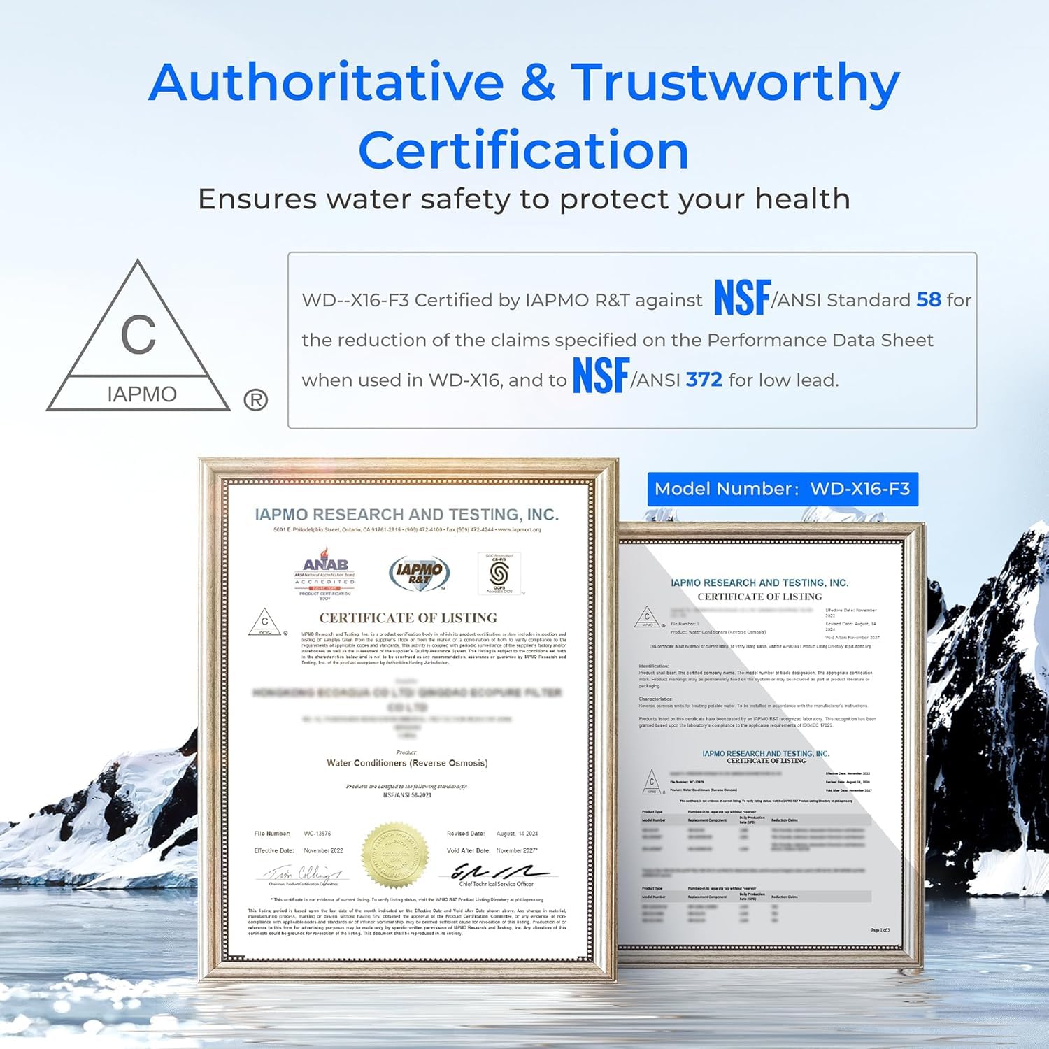 Sicherheit steht bei Waterdrop an erster Stelle – und das spiegelt sich in mehrfacher Zertifizierung wider. Der WD-X16-F3 ist von IAPMO R&T getestet und zertifiziert worden, basierend auf den strengen NSF/ANSI 58- und 372-Normen. Diese Zertifikate garantieren, dass das System die geforderten Leistungs-, Material- und Sicherheitsstandards erfüllt – ein wichtiger Vertrauensfaktor für Verbraucher.